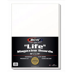 The BCW Life Magazine Backing Boards are made from 24 point solid bleached sulfate, coated and buffered on one side with 3% calcium carbonate, and are precision cut to size. Use this item along with our Life Magazine Bags to protect and store your collectible magazines.