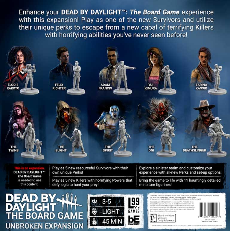 Incarnez cinq nouveaux Survivants , chacun doté d' Atouts uniques qui ouvrent la voie à de nouvelles stratégies de survie. Ou devenez l'un des cinq Tueurs redoutables dont les Pouvoirs tordus et illogiques rendent chaque poursuite imprévisible et terrifiante. Avec de nouveaux atouts, de nouveaux plateaux et des figurines détaillées, cette extension apporte encore plus de profondeur, de rejouabilité et de suspense à vos parties de DBD.