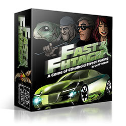 Fast & Fhtagn is a component rich card game where players jockey for position on crowded, dangerous city streets. As the pack hurtles through an everchanging urban landscape, racers must squeeze out their adversaries, accumulate style points, and keep their vehicles running smoothly even as dangers rain down and other drivers plot inhuman violence against them.