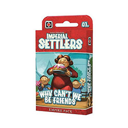 Settlers: Why Can't We Be Friends, the first Empire Pack for Imperial Settlers, includes new common cards for the central deck, new cards for each of the base game's four factions, and two new cards for use in the solo game with some factions.