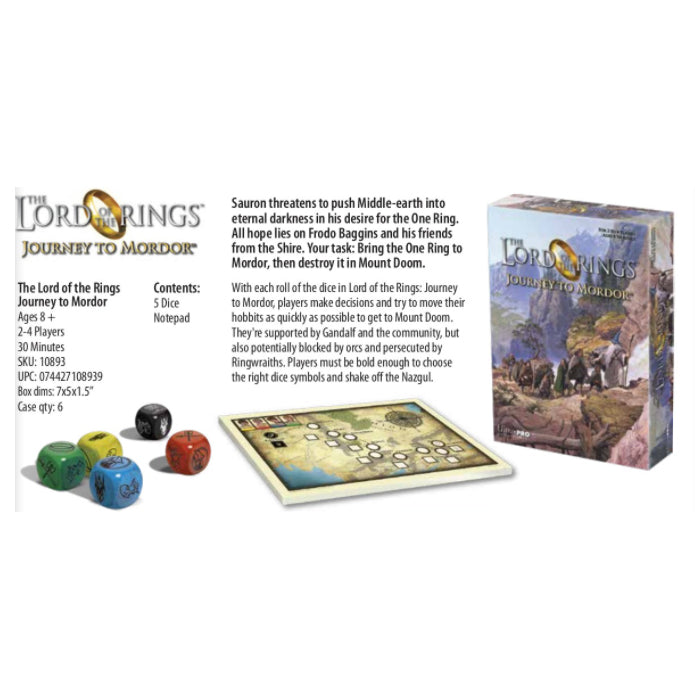 Revivez la quête épique de Frodon Sacquet et des hobbits dans ce jeu de dés rapide et facile à apprendre, se déroulant dans le monde de la Terre du Milieu . Dans Le Seigneur des Anneaux : Voyage vers le Mordor , les forces de Sauron se rapprochent, prêtes à tout pour s'emparer de l' Anneau Unique et plonger le royaume dans les ténèbres. Votre mission est simple, mais périlleuse : rejoignez le Mordor et détruisez l'Anneau dans les flammes de la Montagne du Destin avant que le mal ne vous rattrape.