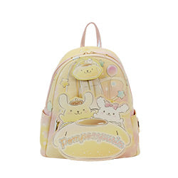 Set your sights on a dreamy spectacle of fun! The Loungefly Pompompurin Carnival Mini Backpack shows your favorite friends as they soar through the sky. On the front zipper pocket, Pompompurin rides a rollercoaster with Macaroon. Up above, the coaster’s tracks rise through the clouds as stars and balloons drift nearby. Slide the cart up and down to set things in motion and turn down the lights to see Pompompurin’s name glow in the dark! Balloons and stars continue onto the bag’s side pockets, and a Pompompurin-shaped balloon appears on the bag’s back. This mini backpack makes an adorable addition to any outfit and will keep your belongings safe as you frolic the day away.