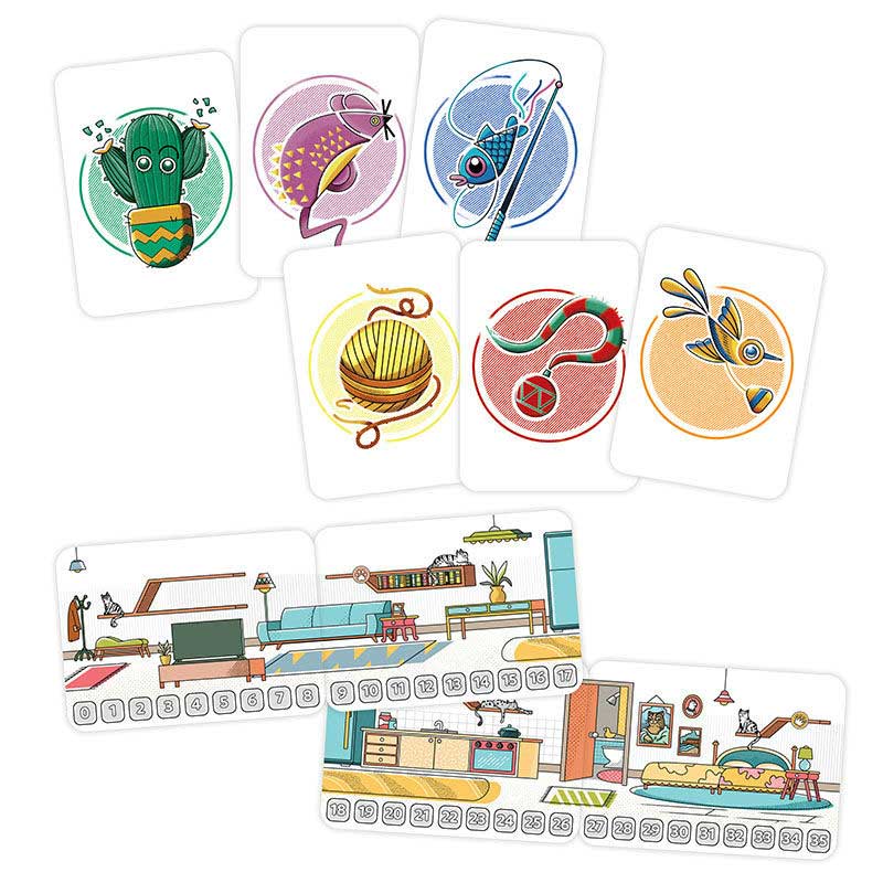 Play your Lure Cards wisely, activate unique Toy suits, track rooms, and position your markers to get closer to the elusive feline. Every round brings shifting priorities, surprising plays, and delightful moments of chaos as the cat token moves from room to room. Only the most clever—and patient—player will win the cat’s affection.